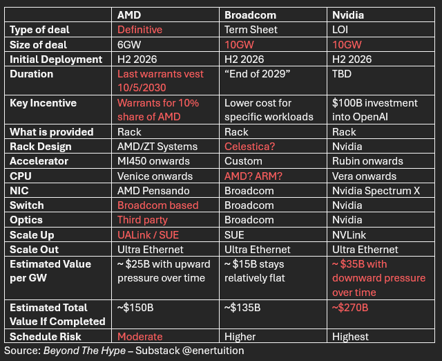Note: In the deployments above, AMD will likely get meaningful CPU revenues in Broadcom and Nvidia deployments. Broadcom will get meaningful networking and optical revenues in AMD deployment and may even capture some revenue share of Nvidia deployment. Also, Nvidia could win standalone networking opportunities in some AMD and Broadcom deployments. This level of detail is being ignored in this table, but investors need to be aware that these companies have incremental upside not shown in the table above.