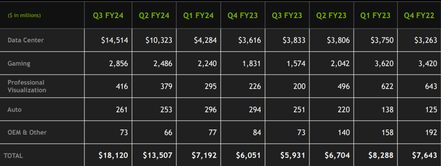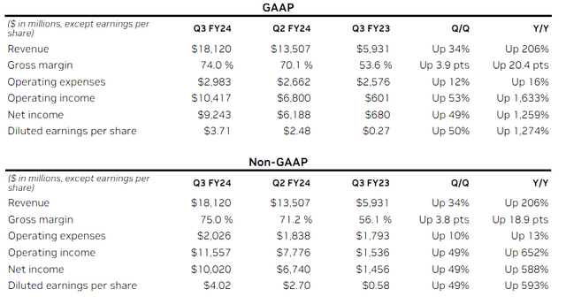 Nvidia (NVDA) delivered strong Q3 FY24 earnings well ahead of guidance and expectations. Revenues of $18.1B (see image below) were about $2B over guidance. Very impressive although part of the strength likely came from the rush to deliver products to China before new restrictions kicked in (and an approximately $2B boost in Singapore sales that was likely also part of the China funnel). EPS grew spectacularly to $4.02 on a non-GAAP basis.